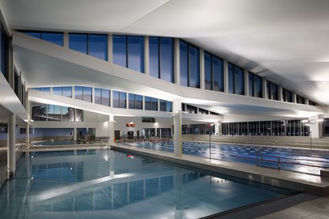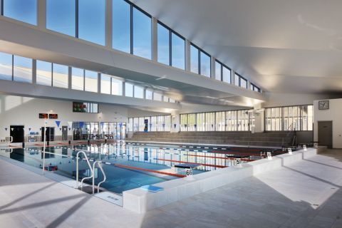 L'architecture du centre aquatique de Viroflay se veut lumineux tout en montrant l'environnement qui entoure le bâtiment.