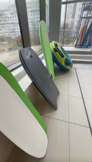 Photo des planches visibles dans cet ordre : wakeskate, bodyboard, surfboard et bouée (de gauche à droite).